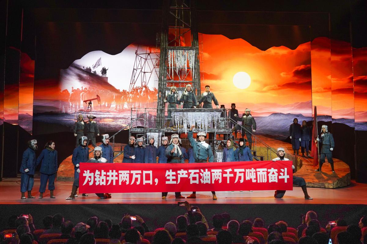 在艺术呈现方面,作品注重历史真实感与舞台表现力的有机统一,创新性融合多种当代戏剧语汇。创作团队运用多媒体投影技术与动态灯光设计营造沉浸式视觉场景,精准再现石油钻井喷涌等历史瞬间;通过富有仪式感的合唱与群舞编排,将钻井、采油等集体生产劳动转化为诗意的舞台动作,赋予工业流程强烈的舞蹈美学与象征意义。