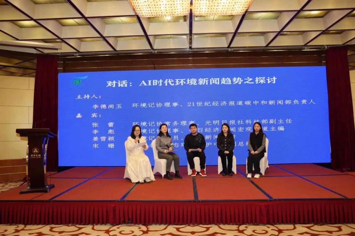 理事、21世纪经济报道碳中和新闻部负责人李德尚玉主持圆桌对话环节。常务理事、光明日报社科技部副主任张蕾,理事、每日经济新闻宏观频道主编李彪,会员、海报新闻记者姜雪颖,泸州老窖生态环境保护中心副总经理宋珊,围绕“AI时代环境新闻趋势之探讨”这一话题开展了对话交流。