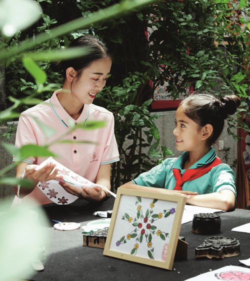学生在英吉沙县国学书院体验国家级非遗——模戳印花布制作。