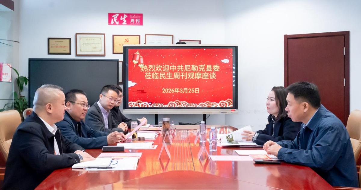 3月25日上午,新疆伊犁哈萨克自治州尼勒克县委常委、宣传部部长塔力努·哈依热拉,中农利邦农业发展有限公司董事长曾异智到访人民日报社,在民生周刊杂志社与总编辑杨明方、副总编辑刘毅等开展座谈交流。双方深入学习习近平总书记关于新疆工作的重要指示精神,结合全党树立和践行正确政绩观学习教育要求,围绕尼勒克县三产融合发展的显著成效、第四届城乡社区高质量发展论坛筹备等议题深入交流。