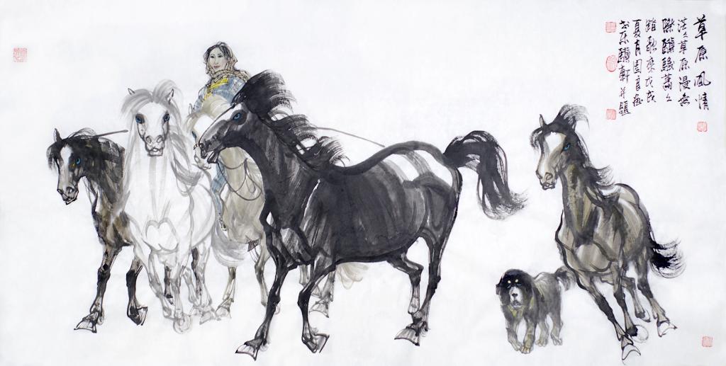 若以上所言不虚,我们以此来对照吴团良的作品,便可以发现吴团良绘画作品所呈现出来的则是一种真正的艺术风格,而且这种艺术风格,极其鲜明和强烈。实际上,表现西部草原的地域风情,尤其是表现以牧民及奔马、骆驼、牦牛等内容为主的人物画创作,并非吴团良一人独擅,而是除吴团良外,有不少其他画家亦深谙此道,且内中不乏赫赫大家,然而吴团良的作品和其他画家的同类作品相比,却有着明显的区别,有着一种不同凡响的艺术个性和独树一帜的艺术风格。这种艺术个性和艺术风格简言之,便是与其他画家的同类作品相比,吴团良的作品显得更朴拙、更厚重、更本真、更大气,更原汁原味,入骨入髓,可谓动静有致,风情万种,既悦目又耐读,在一个很高的层面上做到雅俗共赏,而不象有些画家画此类作品时那样或多或少地象是一个置身局外的旁观者,终究隔了一层。