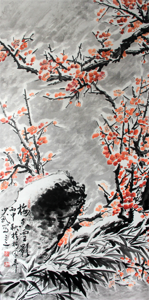 中国传统文化源远流长、博大精深,就写意画的发展和影响而言,明代的徐渭徐开创了写意画的先河,也是中国“泼墨大写意画派”的创始人,写神而不求形似的艺术人生对后世影响深远,他的山水、人物、花鸟、竹石无所不精,尤以花卉最为著称,开创了一代写意画风,徐渭凭借自己特有的才华,成为当时最有成就的写意画大师,他的写意水墨花鸟画,气势纵横奔放,不拘小节,笔简意赅,用墨多用泼墨,很少着色,层次分明,水墨淋漓,生动无比,对于对后世花坛的画家如八大山人,石涛,齐白石,潘天寿,李苦禅等都有极大的影响,在他之后的八大山人善画山水和花鸟,他的画笔情纵肆,逸气横生,章法不求完整,但气势如虹,画面峥嵘;石涛山水画构图讲究“新、奇”,他善于处理画面上平远、深远、高远景致的关系,局部特写,使山水画有新奇的表现,他画山水用墨湿枯并用,浓淡结合,它的湿笔运用灵活精到,尤其是他用笔墨融合及水墨渗透之技法表现出山野的层次感、空间感,彰显自己独特的风格;吴昌硕线条古朴雄健,突出圆笔“中锋”的特点,笔墨滋润明洁、圆韵、凝重、清润,以六朝碑法作书画面,绘画是从白阳、青藤、赵之谦、八大、任伯年等画中吸取清新醇厚的之气;齐白石“妙在似与不似之间”,衰年变法,绘画师徐渭、朱耷、石涛、吴昌硕等,形成独特的大写意风格,开红花墨叶一派,尤以瓜果菜蔬、花鸟虫鱼为工绝;李苦禅是齐白石的得意弟子,其用墨干净明亮,其绘画的五墨俱全,墨色淋漓,层次分明;潘天寿画风是建立在各家传统画风之上,其主要借鉴了董源的骨法用笔,元四家的气韵,石涛、八大的意境,当然也有马远、夏圭之功。尤其在传统基础上又破前人法度,进行大胆创变,笔墨线条引入隶书和魏碑的笔法,线条方折,追求力与美的构成,形成“霸悍”之气。