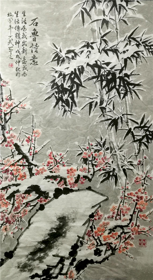继承中追求创新,才是有源之水,历代大师尚且如此,当代艺术家如果要有所突破、有所成就的话,必须一手扎根传统,一手进行创新,否则,艺术的创新就只能是无本之木,不能行之久远。花鸟画家黄少武自幼绘画从素描开始,和当代功成名就的艺术家一样,他对绘画中的色彩、静物、写生的深入乃必备基础,临摹传统历代名家名作也是他吸收艺术滋养,不可或缺的一门功课,黄少武小时候受条件限制,并没有像其他子承父业的画家那样,师承家学,但,他对绘画艺术的天性使然,让他走上中国画道路的第一口奶则是历代名家都不曾远离的“芥子园画谱”,那些时光,年轻的黄少武对“芥子园画谱”,朝夕临摹,爱不释手,几近痴迷,尤其是“芥子园画谱”里,花鸟画的绘画方式方法、穿插组合、布局变化、用笔用墨等技法让黄少武刻骨铭心,如基因一样流淌在黄少武的艺术血脉之中。艰苦的磨砺成就非凡的艺术世界,心追手摩加勤学苦练,传统绘画的一招一式在黄少武笔下信手拈来、游刃有余。纵观黄少武作品,自然之中的梅、兰、竹、菊皆成笔下之美,书法入画以写实为主兼具神态之变,笔墨酣畅淋漓,他把书法的侧锋、顺锋、逆锋、散锋,笔墨速度上又有急徐、快慢、涩畅,以及行笔中的点戳、提按、顿挫等笔法变化表现在画面中,让画面浓淡干湿,疏密相间,富有变化。黄少武创作中喜欢静的画面,喜欢素雅的表现。所以他很少用浓烈的颜色点缀作品,他善于用充足的水分和色彩进行调和,显得恰到好处,色墨相间,互生奇妙,充满祥和之气,与用墨、用彩相比,他更喜于淡墨与浓墨交融配以书法笔意成画,而凸显画面的金石味,这样让他的作品有别于古人、有别于今人,而又整体显得高雅别致。