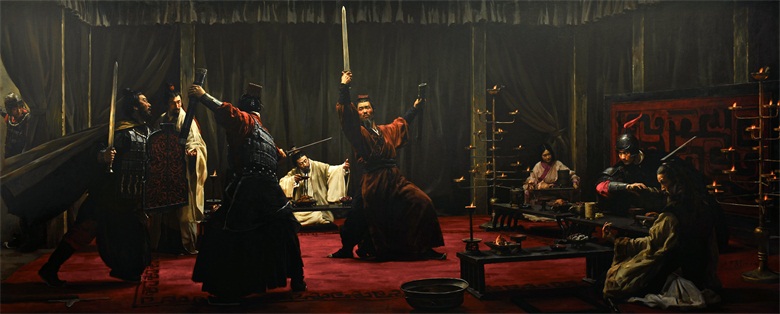 若无此宴,楚汉之争便不会存在。更不会有“明修栈道,暗度陈仓”、“鸿沟之约”、“垓下之围”、“十面埋伏”、“四面楚歌”、“霸王别姬”、“乌江自刎”等名垂千古的历史事件。汉之兴盛也无从谈起,中国历史将会重新改写。所以我选鸿门宴作为楚汉相争的唯一选题,其戏剧性的画面非常适合用油画来表现。