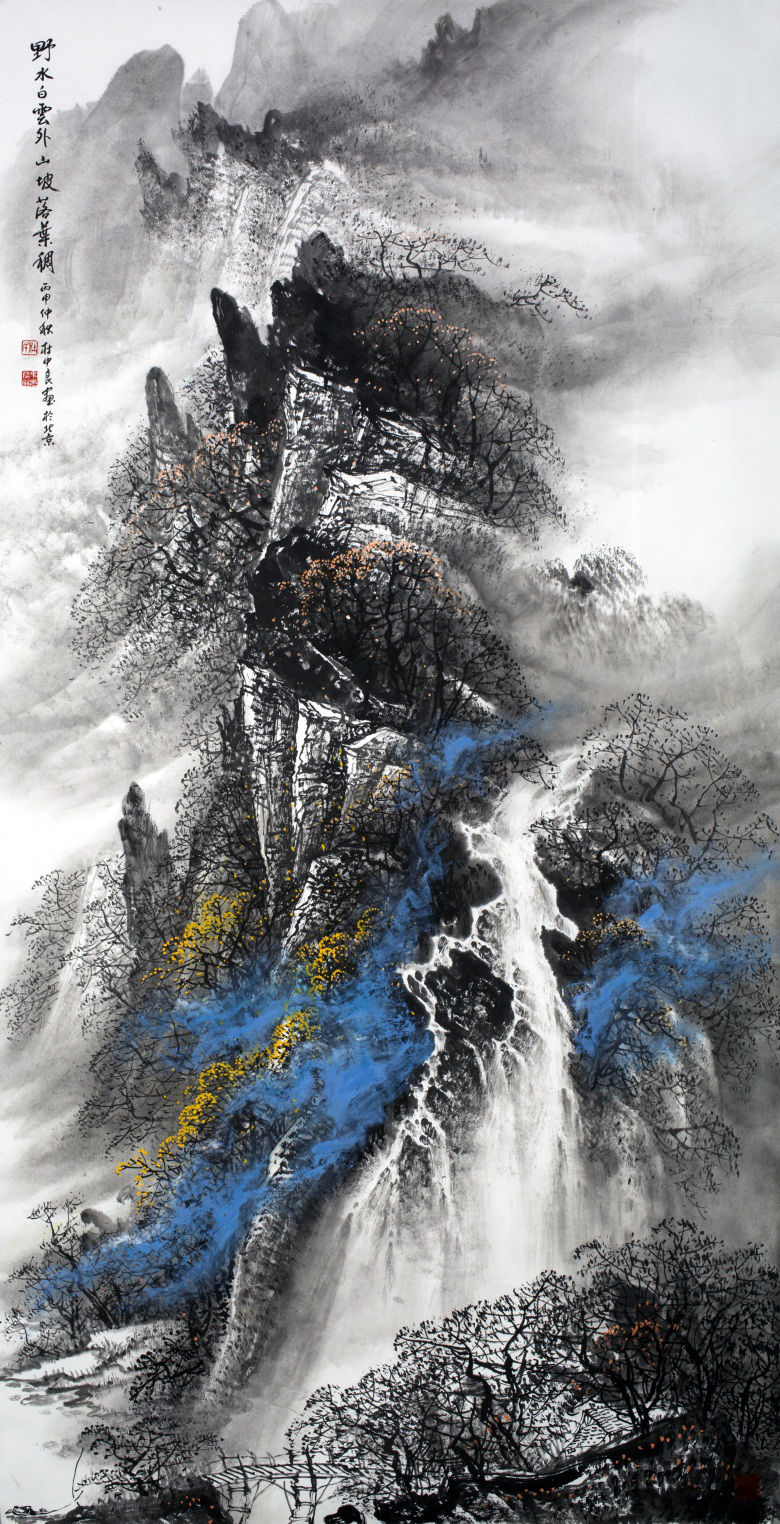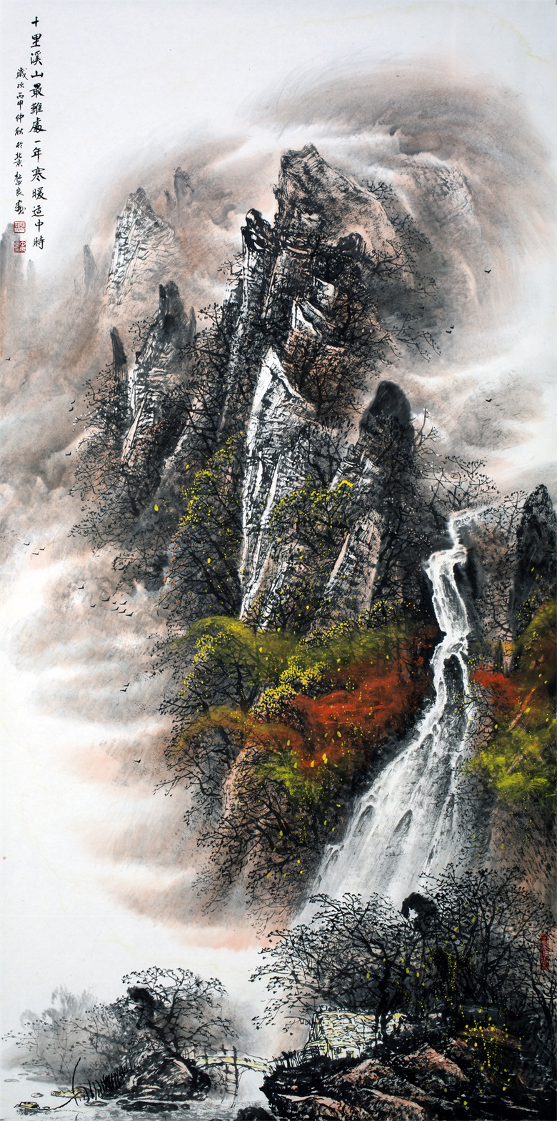 所谓“新境”是指杜中良赋予自己的艺术境界以强烈的时代感和创造精神。他在宏观把握传统精神、全面理解传统真谛的基础上,广蓄了自然的英华,饱纳了山川灵气之后,以笔墨、丘壑互为体用之法,淘练出新的绘画语言,着力于气韵与境界的追求,给人以一种清新之美、蓊郁之美、逸宕之美。不期而然地溶解了西方绘画对他有用的东西,如光影、构成、色彩等与笔趣、墨韵的相合,结构出具有现代感的新境界。他的“新境”不是“雨后空林”无人间烟火味的“雅玩”之作,也不是“雪景寒林”冷峻荒凉的“萧疏”之象,而是云蒸霞蔚、雾绕群山的锦绣景观,是雄伟博大、真率烂漫的瑰丽山河。画中境象不是哪座大山的再现,也不是哪条江河的描摹,却有着太行的雄肆、华山的险峻、黄山的神奇、峨眉的灵秀、武夷的妩媚。那老辣苍翠的云壑山涧,那韶秀幽深的茂林鸣泉,那墨彩流溢的田园风光,那旖旎典雅的山野景象,传递的不是文人的忧患意识与自我遣兴,而是完全出于对祖国河山的热爱和对自然大美的颂扬。所谓“北势”是指他的山水画偏于北派山水的气势与布局,传承了元代以前相当繁荣过的西部、北部、中原诸地区的艺术风格传统,尤其是“北派”山水的风骨雄魂,其纵横跌宕之势、鬼斧神工之奇,构成了他的山水画的显著特征。杜中良用他的画笔饱蘸生命中难以割舍的山水之情,去构筑北方山水博大精深的气势,去营造大山雄、秀、险、幽的意境。那种令人怦然心动的景观,深情地注入整个民族的历史记忆和现实感奋,表现的不仅仅是自然空间,而是“天人合一”、“物我两忘”的精神空间。那种崇高的美感,是精神世界的碰撞,是生命与生命的交融,是民族生存的伟大空间和高昂精神的感情投射。