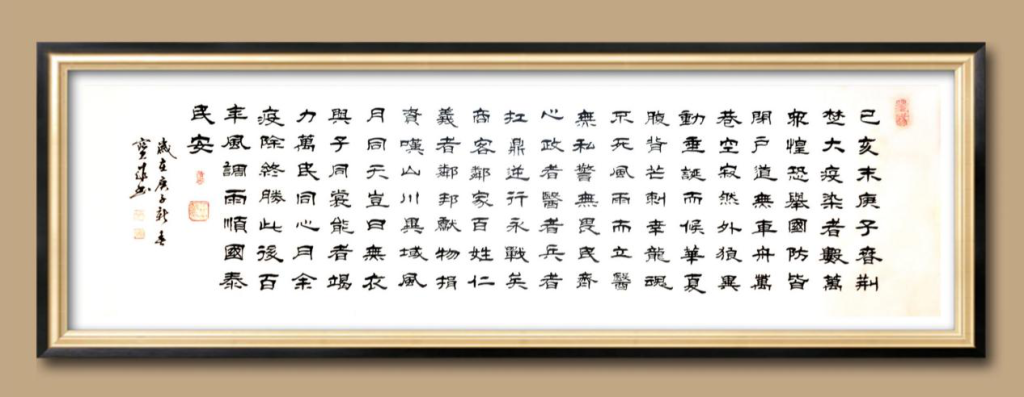 己亥未,庚子春,荆楚大疫。染者数万,众惶恐。举国防,皆闭户。道无车舟,万巷空寂。然外狼意动,垂诞而候。华夏腹背芒刺,幸龙魂不死。风雨而立,医无私,警无畏,民齐心。政者、医者、兵者,扛鼎逆行,永战矣。商客、邻家、百姓、仁义者,邻邦献物捐资。叹山川异域,风月同天,岂曰无衣,与子同裳。能者谒力,万民同心。月余,疫除,终胜。此后百年,风调雨顺,国泰民安。