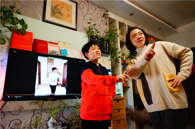 许昌市古槐街小学六(2)班学生宋崇璟在妈妈李秋霞的指导下,共同认真学习战役戏曲。图\袁洋