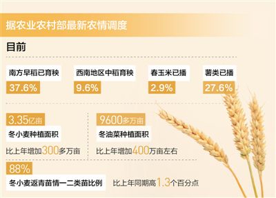 当前,全国春季农业生产如火如荼,正由南向北渐次展开。据农业农村部最新农情调度,目前全国春播粮食已播4.5%,其中,南方早稻已育秧37.6%,西南地区中稻育秧9.6%,春玉米已播2.9%,薯类已播27.6%。今年冬小麦、冬油菜种植面积双双实现恢复增长。冬小麦种植面积3.35亿亩,比上年增加300多万亩;冬油菜种植面积9600多万亩,比上年增加400万亩左右。冬小麦返青苗情一二类苗比例88%,比上年同期高1.3个百分点。多数地方冬小麦、冬油菜长势好于上年,实现夏季粮油丰收有较好基础。