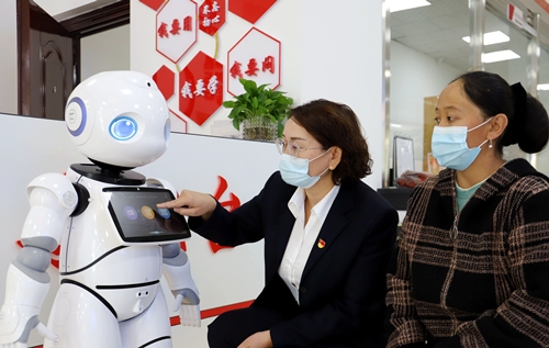 ▲5G农牧民服务E站,工作人员帮助农牧民使用办事机器人。