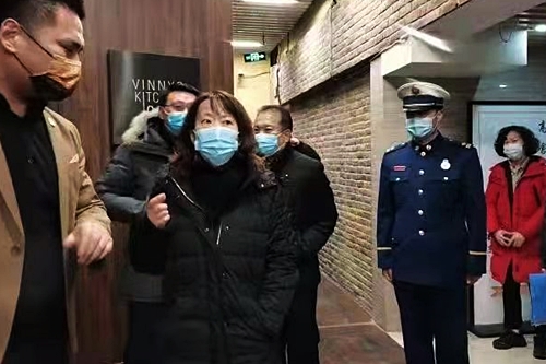 麦子店街道工委书记刘晓玲(左二)在汇佳大厦进行消防安全检查