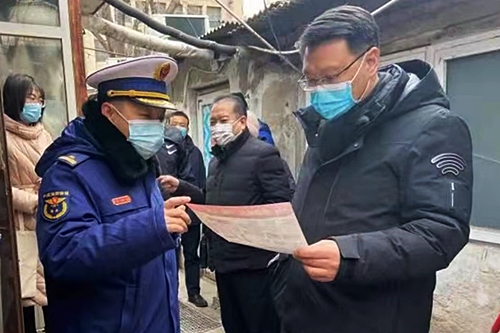 麦子店街道办事处主任李霄(右一)检查平房院落消防工作