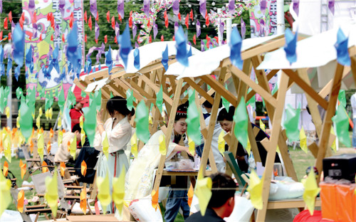 ▲青年艺术市集上,湖州职业技术学院的师生带来瓷绘、陶艺、扎染、篆刻等趣味文创和文艺表演。图/项飞