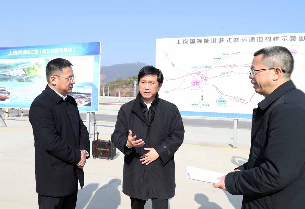 ▲邱向军(中)在上饶西货站调研运营情况。