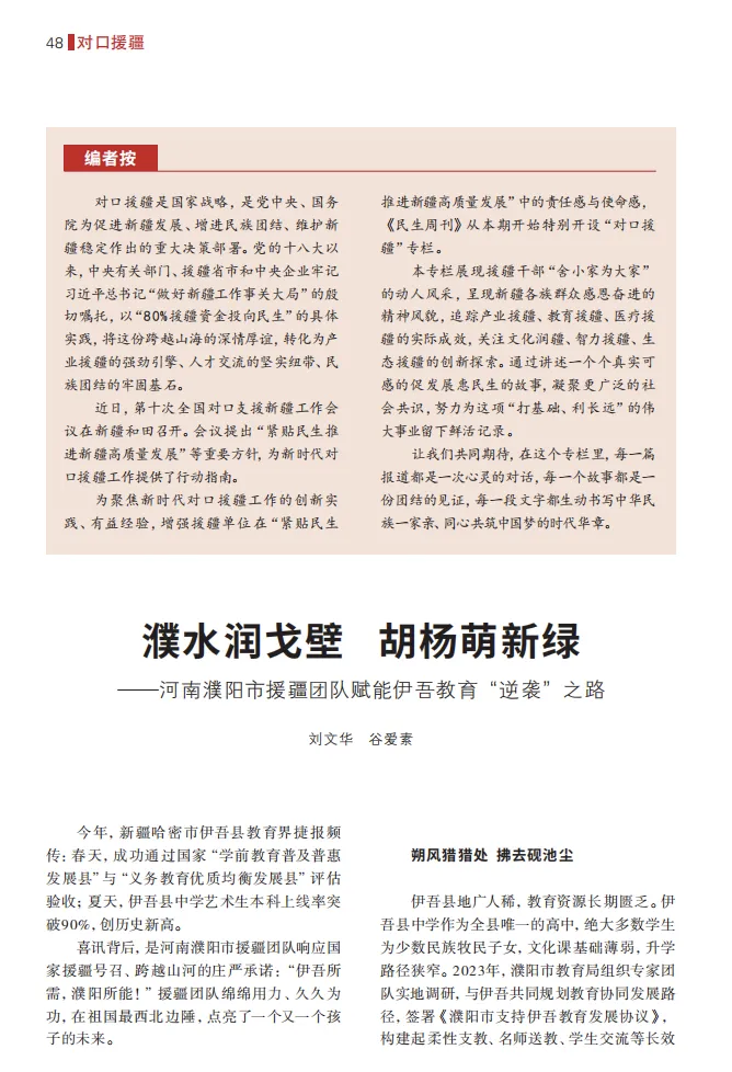 为聚焦新时代对口援疆工作的创新实践、有益经验,增强援疆单位在“紧贴民生推进新疆高质量发展”中的责任感与使命感,《民生周刊》从本期开始特别开设“对口援疆”专栏。