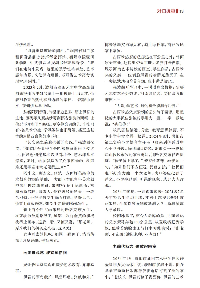“困境也是破局的契机。”河南省对口援疆伊吾县前方指挥部指挥长、濮阳市援疆团队领队、中共伊吾县委副书记郭现锋说,“我们在走访中发现,这里的孩子性格奔放、艺术感知力强,文化课有短板,或可借艺术高考实现弯道突围。”