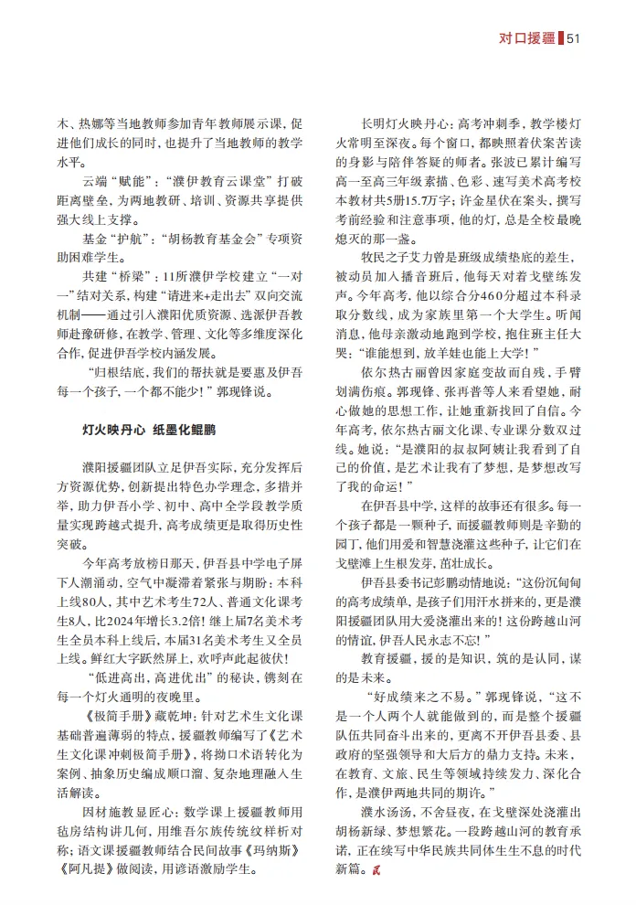 “好成绩来之不易。”郭现锋说,“这不是一个人两个人就能做到的,而是整个援疆队伍共同奋斗出来的,更离不开伊吾县委、县政府的坚强领导和大后方的鼎力支持。未来,在教育、文旅、民生等领域持续发力、深化合作,是濮伊两地共同的期许。”