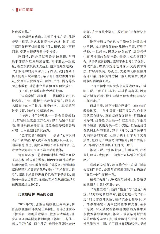 2024年4月,濮阳市油田艺术中学校长许金星刚办妥退休手续,濮阳市援疆干部、伊吾县教育局局长张再普便把电话打到了他的家中。“老校长,伊吾的孩子需要你,伊吾的艺术教育需要你。”