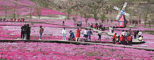 新疆石河子市将军山辽疆生态园芝樱花海吸引众多游客前来打卡。