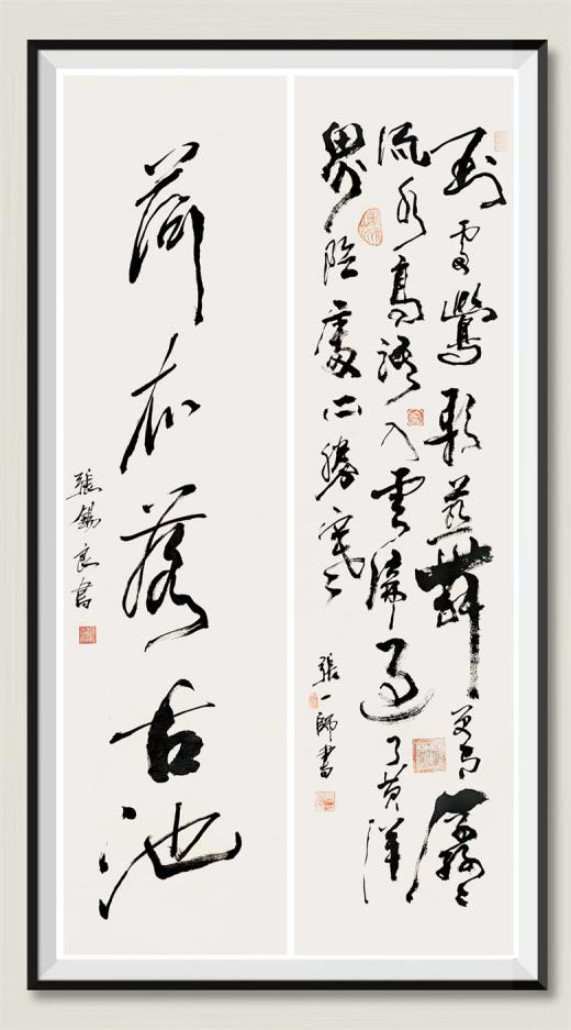 扎根传统是从的“行”的笔意中,笔者看到了“二王”一脉相承的行书脉络,如对赵孟頫的汲取,如对董其昌的借鉴,而在“草”的笔意中,笔者看到了王铎、傅山的痕迹,当然,“颠张醉素”也总是若隐若现。