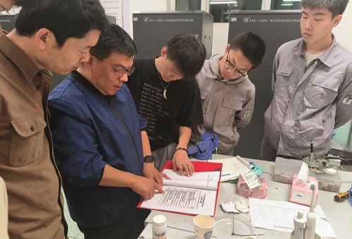 刘盛(左二)在指导学生参加技能大赛。