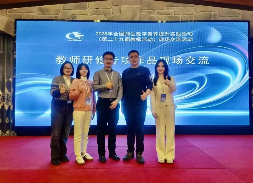 在教师研修专项领域,汪禹彤、江秀、刘丽华老师的《AI技术支持下的初中语文文言文教学能力提升》获评“创新案例”;彭邻心、张静怡、陈春燕老师的《2022版义教英语课标下项目式学习与数字化集体备课实践探究》与蔡丽平、郭雪云、刘璐老师的《初中历史跨学科融合设计能力提升的数字化路径探究》均获评“培育案例”。汪禹彤、江秀、刘丽华三位老师还受邀参加了2025年全国师生数字素养提升实践活动的现场交流。汪禹彤分享的“五定七环”校本研修模式,赢得专家与同行的高度赞誉。