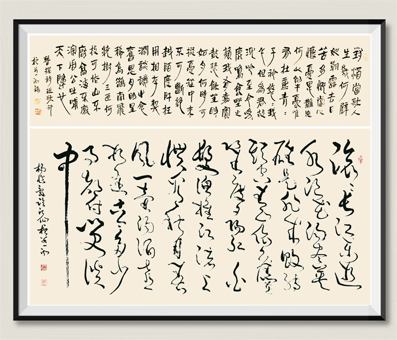 入笔、行笔、收笔,或快或慢或收或放或开或合,点有高山坠石之势、有百钧弩发之感、有鲲鹏击水之态,线有万岁枯藤之质、千里阵云之形、长虹饮涧之姿,却不能言其真,更不能道其妙,因为,一切都在情理之中,又常常出于意料之外,在情理之中的是法度,意料之外则给人一种意想不到的惊奇,那惊奇是若隐若现的个人才情、是乍合乍离的独特表现,属于张延明的别致、属于张延明的神韵,得益于几十年精修入境的传统功力,又以所感所悟融入对传统书法的理解而铸就了一家之貌的笔端升华。