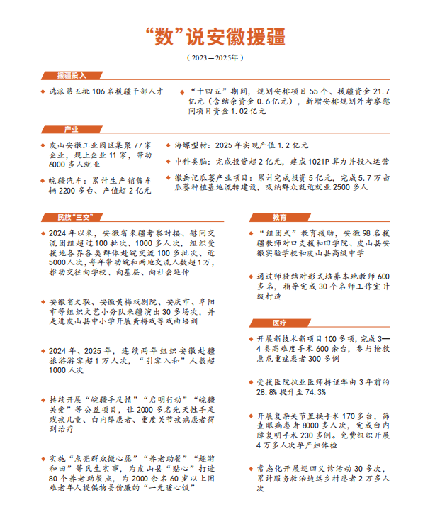 从戈壁滩上崛起的瓜蒌产业园到现代课堂里传来的琅琅书声;从县域医院里成功开展的高难度手术到两地家庭间结下的血脉亲情……安徽援疆以产业筑基、以教育扶智、以医疗护航、以文化凝心,全方位助力皮山夯实发展根基、激活内生动力。