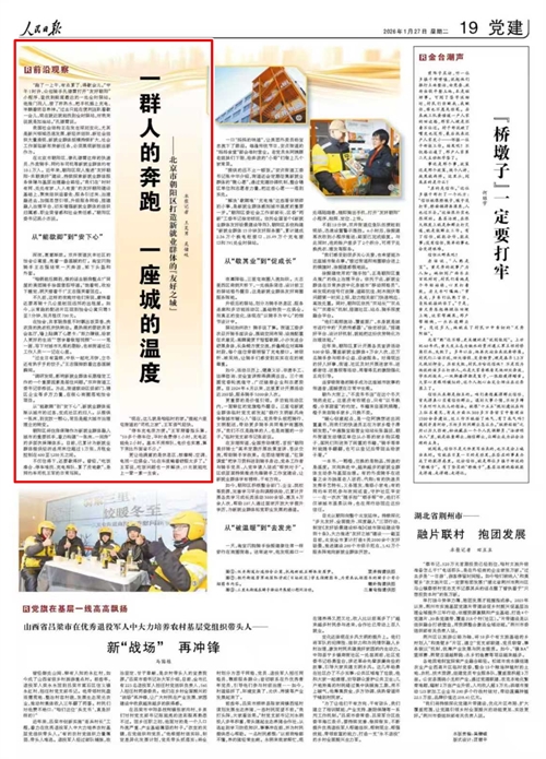 在北京市朝阳区,像孔德霄这样的快递员、外卖骑手、网约车司机等新就业群体约有10.1万人。近年来,朝阳区深入推进“友好朝阳·共朝美好”建设,持续探索新就业群体服务保障与基层治理融合路径。“我们在‘时时有网、处处有家、人人有爱’的友好朝阳建设基础上,聚焦组织追着走、服务引过来、治理融进去,加强思想引领,升级服务网络,搭建融入治理平台,切实增强新就业群体的组织归属感、职业荣誉感和社会责任感。”朝阳区委书记吴小杰说。