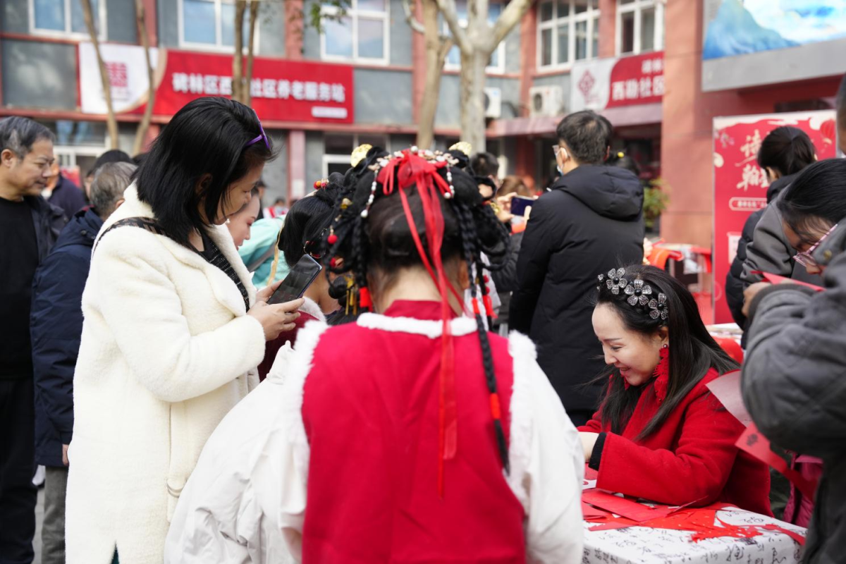 活动现场,新春文化集市也在欢声笑语中同步启动。集市设有春联书画创作区、诗词拓印体验区、诗词飞花令区、剪纸非遗展示区等多元文化板块,吸引众多居民驻足参与。书法家现场挥毫,非遗传承人展示技艺,市民在墨香与纸韵间感受唐诗之雅、传统之美。更值得一提的是,活动还融合了便民服务内容,如免费理发、健康义诊等,切实体现“文化惠民、服务暖民”的宗旨,让居民在享受文化滋养的同时,也感受到实实在在的生活关怀,真正实现了“文化惠民零距离”的宗旨。
