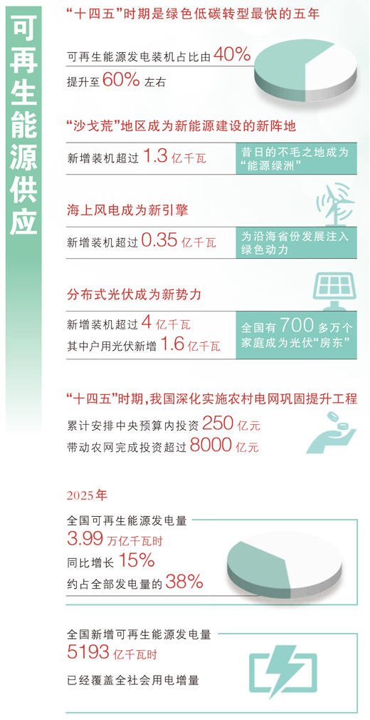 能源体系的稳定,是发展的坚实根基。各行各业向高端化、智能化、绿色化深度转型,背后离不开电力的支撑,全球最大的可再生能源体系能让更多“风吹、日晒、水流”转化为绿色电力,充足的能源供应和储备重塑着产业生态与竞争力,成为经济社会高质量发展的稳定器和助推器。