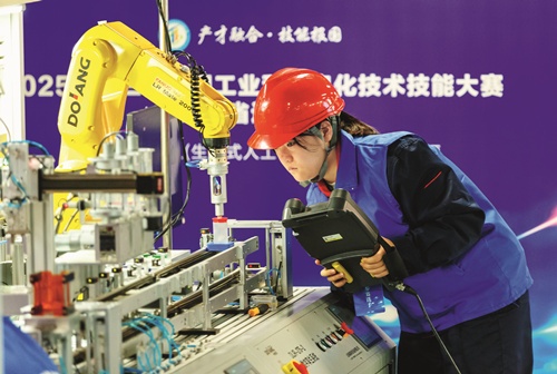 2025年第三届全国工业和信息化技术技能大赛山东省选拔赛上,选手正在参加生成式人工智能系统应用员(智能工业机器人)赛项比赛。(翟慎安/人民图片)