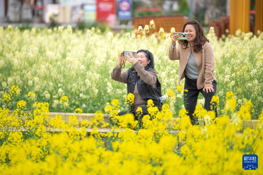 3月9日,游客在油菜花田游玩。
