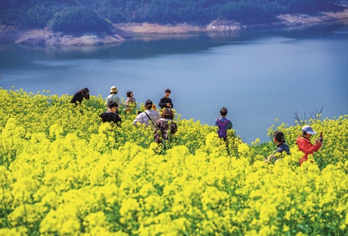 3月7日,浙江省绍兴市新昌县沃洲湖,油菜花绽放,吸引游客前来踏春赏花。(潘伟峰/人民图片)
