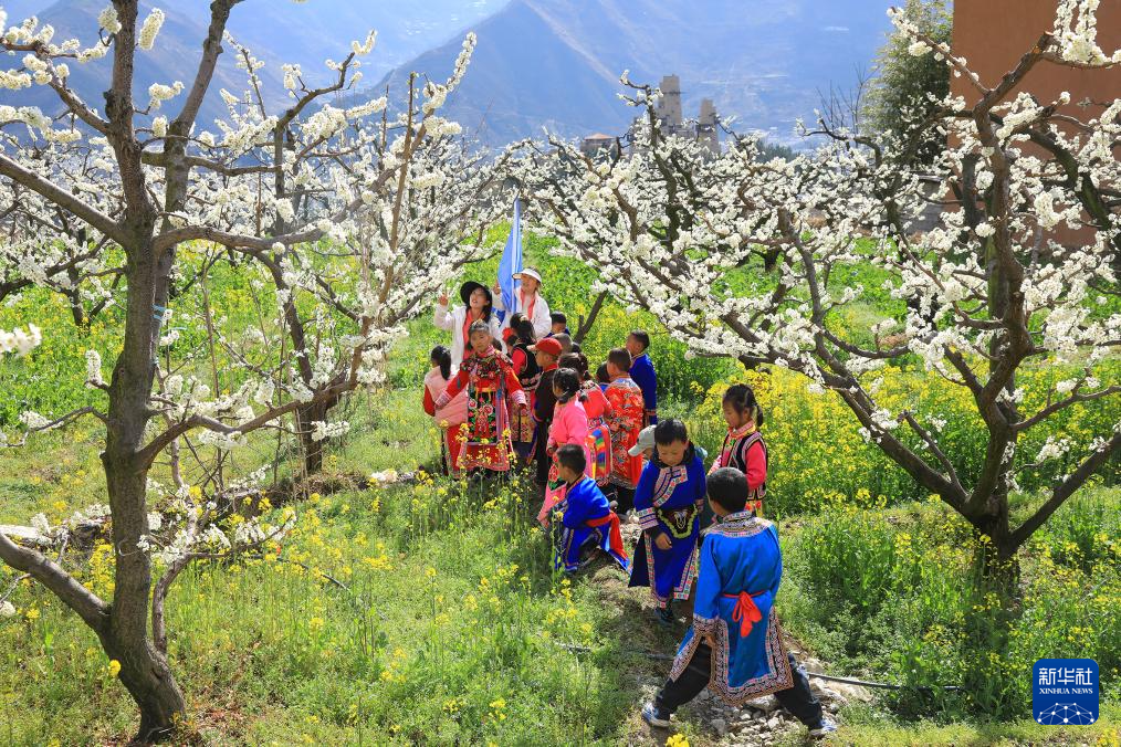 3月24日,四川省阿坝州茂县蓝天幼儿园的孩子们在凤仪镇坪头村赏花。