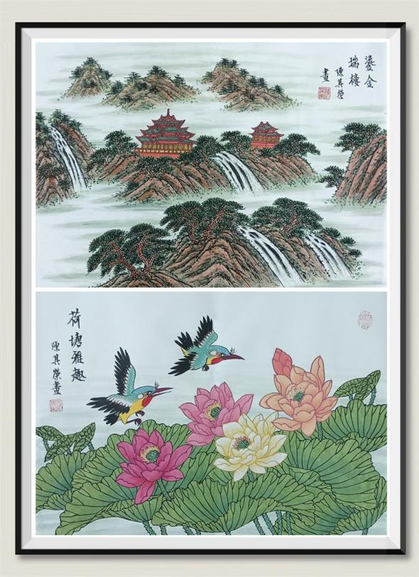 陈其荣的山水画喜在崇山峻岭,青峦绿峰,云雾迷蒙间,画设宫殿楼台,以现华夏神州,江山如画的壮丽景象。