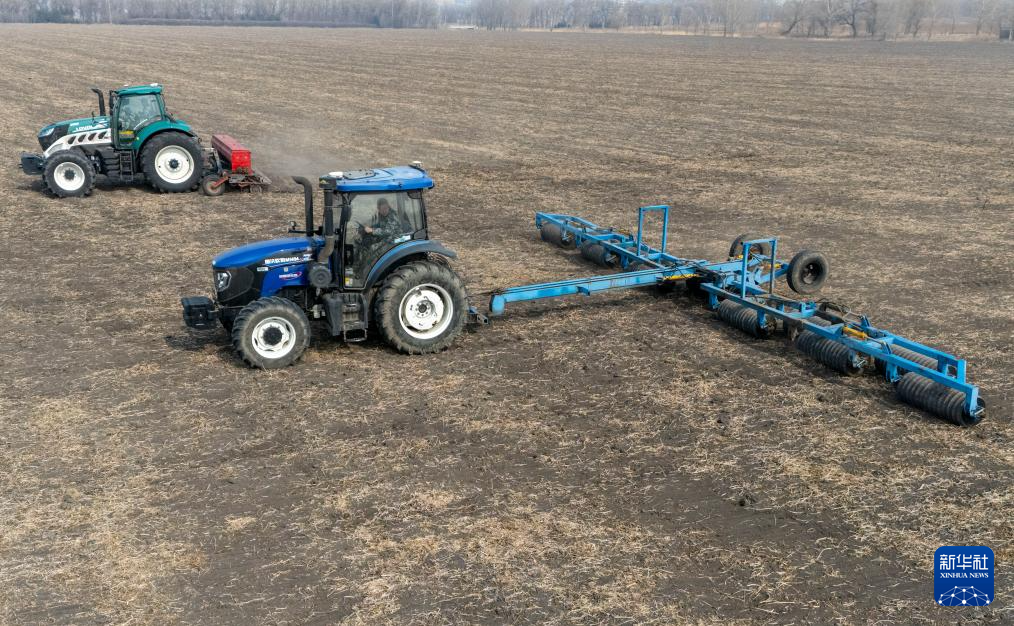 3月25日,农机在位于黑龙江省哈尔滨市的北大荒集团闫家岗农场有限公司一处耕地上播种小麦(无人机照片)。