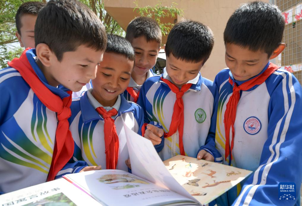 4月21日,在新疆新和县依其艾日克镇木纳尔村小学,小朋友们在“图书巴扎”上阅读图书。