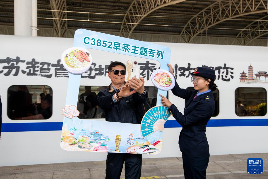 4月25日,上海至泰州早茶主题旅游专列正式首发,大批上海游客乘专列奔赴江苏泰州,品鉴特色早茶,欣赏水乡风光。依托2026年苏超泰州主场赛事节点,泰州将常态化开行主题旅游专列,持续推动“铁路+文旅”融合发展。