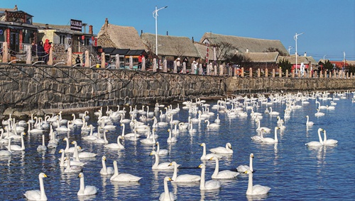 山东省荣成市俚岛镇烟墩角村天鹅海湾,游客在悠闲地拍照游览。(李信君/人民图片)