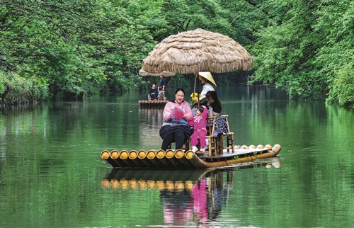 安徽省黄山市徽州区西溪南村枫杨林间,游客乘竹筏在丰乐河上游玩。(樊成柱/人民图片)