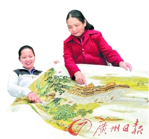 邓菊莲(左)在展示自己的作品。