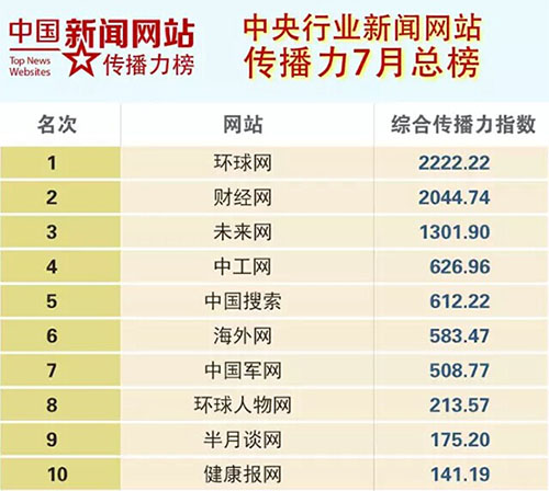 从综合榜来看,环球网超越财经网、未来网夺得本月传播力之首,中工网逆袭,首闯行业新闻网站前十,并位列第四。