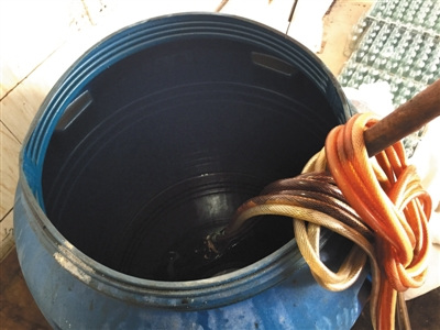 1月11日,在独流镇一户生产假酱油的村民家中,造假者就是用这个大塑料桶勾兑假酱油。像这样的大桶,这家一共有三个。
