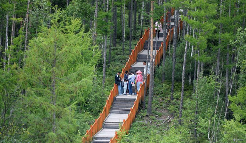 游客在大兴安岭腹地的呼中区大白山风景区游览(2016年8月3日摄)。