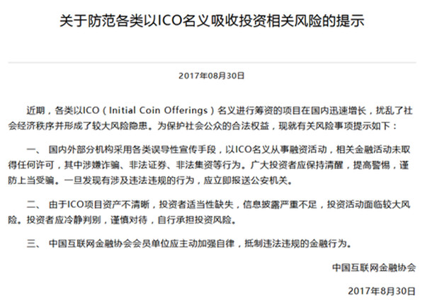 8月30日,互联网金融协会发出《关于防范各类以ICO名义吸收投资相关风险的提示》,指出“扰乱了社会经济秩序并形成了较大风险隐患。”
