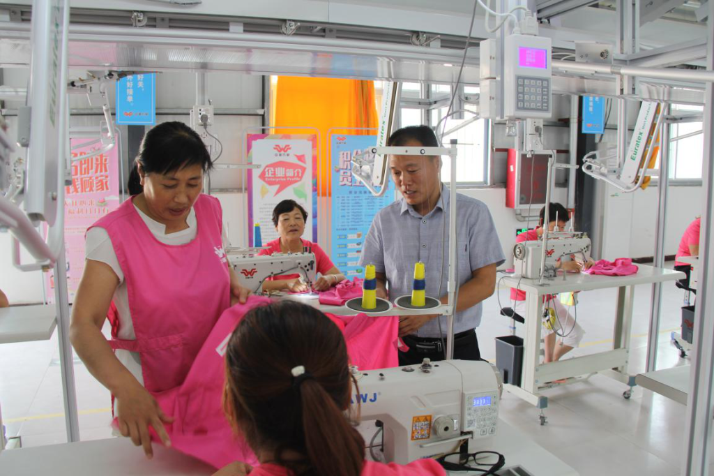 在妆头村扶贫就业基地的“巧媳妇”服装加工车间内,工人们按照流水线要求,熟练地缝纫布料。