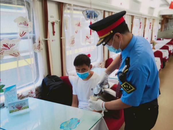 2020年8月19日,山西太原铁路局太原客运段运京车队担当的K603次列车在北京站放行期间,站台上由车站值班员引导的一名盲人旅客引起了列车长任世伟的注意。列车长任世伟立即上前询问情况,随后将这位旅客搀扶上车后,合理安排在餐车,并安排列车员重点服务,为其打上热水。灵丘站到站后,列车长帮扶旅客下车,并与车站进行交接。列车长和乘务员面对旅客乘车困难,伸出援助友谊之手,给予细心的照顾与热情的帮助,让旅客感受到列车的温暖,点亮了回家的路。