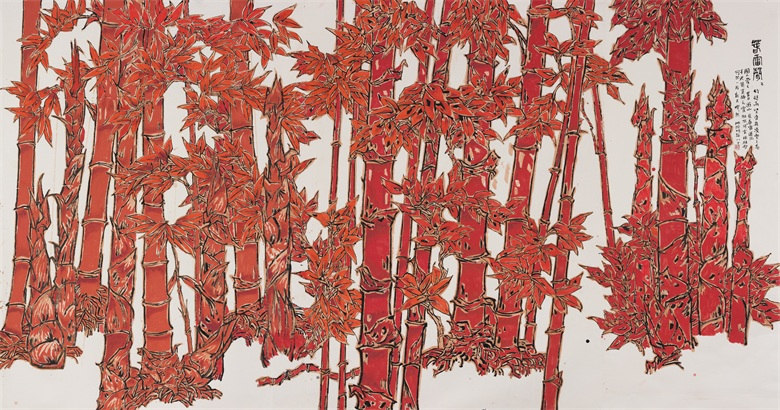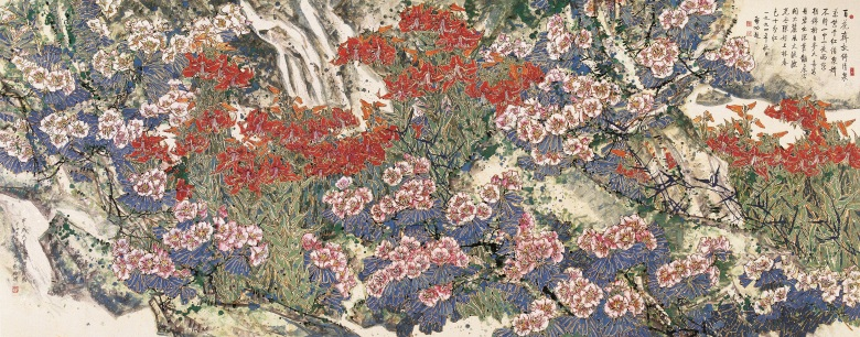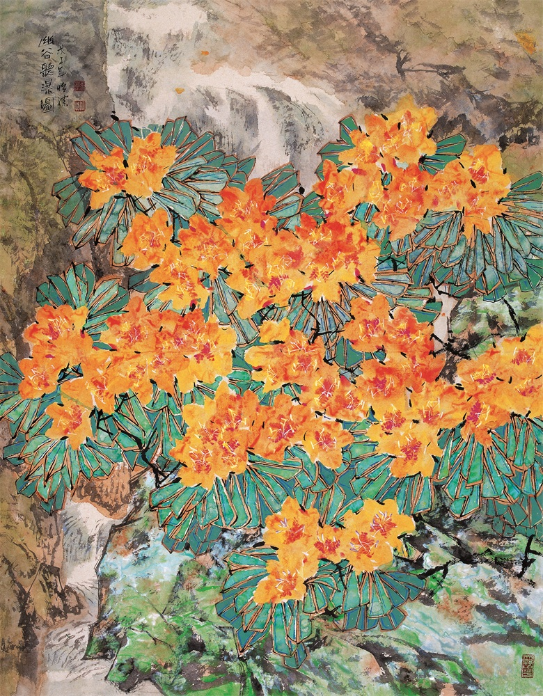 郭怡孮的画也不一定刻意避免“比”,但他在寄寓一种“比”的观念时,处理得很含蓄,往往将其纳入一个悠广的历史时空中。如《楚泽之畔》《故园篱落》《灞桥风雪》等,兰、菊、梅的“文化形象”固然为人熟悉,由文化所赋予的品格通过移情也能理喻,但其语境似乎比文人画处理此类题材时要宽泛和朦胧一些。无论从意境,还是从色彩、笔墨,那种自然秉赋的美丽和生气,更直接地引发我们的感兴,恰如谢灵运推开窗户看到一池春草而不假思索吟出千古名句“池塘生春草”那样。池塘春草显然没有什么明确的寄寓,“谓之有托佳,谓之无托尤佳。无托者,正可令人有托也。”“绝不欲关人意,而千古有意人意自不容不动。”“可以生无穷之情,而情了无寄。”清代大学者王夫之这些论诗的话,可以帮助我们理解郭怡孮那些美丽的画卷。尽管他给中南海画大幅映山红时题名《春光图》,画内罗毕火红的剌桐花时加了个副标题《我的内罗毕宣言》,画香港紫荆花时也加了一个副标题《为1997香港回归而作》,明确表达了他的寄托,甚至超越审美而有些政治化,但这都不重要。映山红同革命,剌桐花同环境保护,紫荆花同香港回归,这种意义的关联是否有助于作品立意的深化,人言言殊,我还是认为王夫之的话更通达一些。郭怡孮在他的艺术笔记里写道:“这是一个线条和色彩的世界,也是一个奇妙的家园,她的璀璨、明丽和神奇,使我充分展开联想的翅膀,如同去构造一个美丽的童话。”