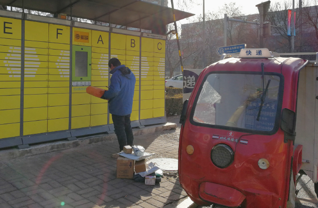 ▲北京某小区,快递员将包裹投进快递柜。图/杨东儒