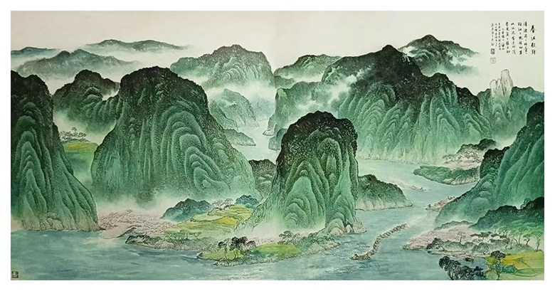 华拓吸收了很多,也融合了很多,可是,透过华拓的青绿山水,可以发现,华拓绝不重复传统经典的样式,即便是早期的《秋艳》《放筏》《大河源头春》《翠峡轻舟图》《宁河逐春图》《春江放筏图》等等作品,也无半点挪用或拼接前人艺术符号的痕迹,而是倾注一种契合当代青绿山水的终极关怀,贯注着血脉偾张的生命力去抒发性情,表达内心对眼中世界的感观,让心境随着色彩的变化而变化,让情感进入心灵深处而感动,这种表现状态是“凡数万本,方得其真”的妙造过程,也是精神往来于色彩之间的衷情倾吐。